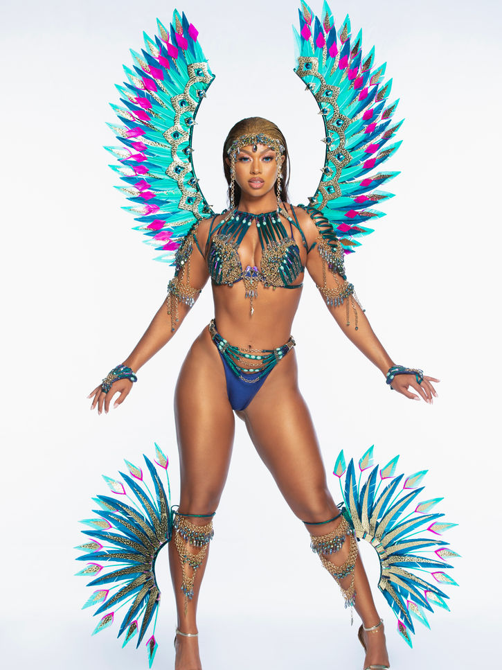 Contrasting the dark teal, accents of light blue bring an icy touch, symbolic of the cold Nordic climate. The lavish gold details speak to Loki's royal lineage and charisma, while splashes of fuschia pink evoke his playful, unpredictable nature. These bold colors are incorporated in varying forms - from intricate embroidery to dazzling gemstones. The finishing touch is a mesmerizing headpiece that encapsulates this color palette, adding to the costume's regal allure. The Loki Allure costume by NNJM Designs is a spectacular interpretation of the Norse deity's captivating personality, providing an outfit that is as charismatic as it is visually stunning.